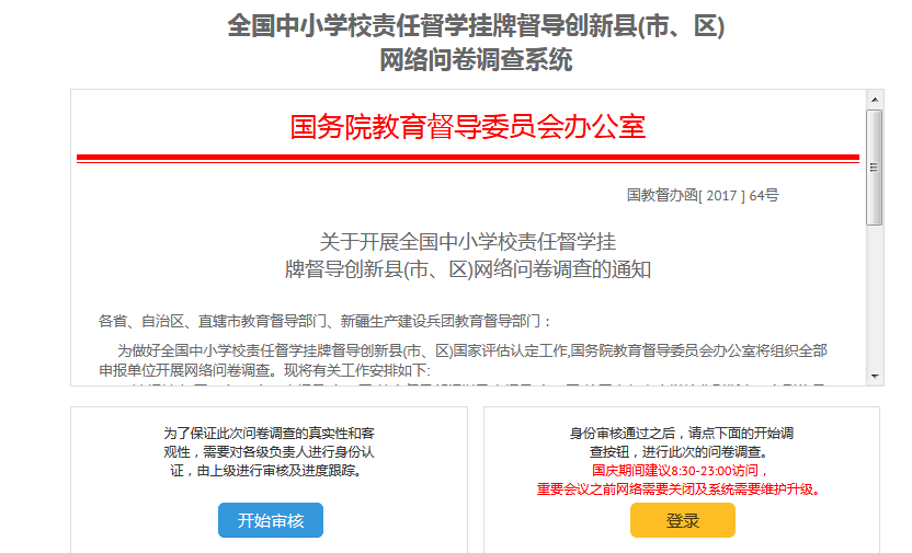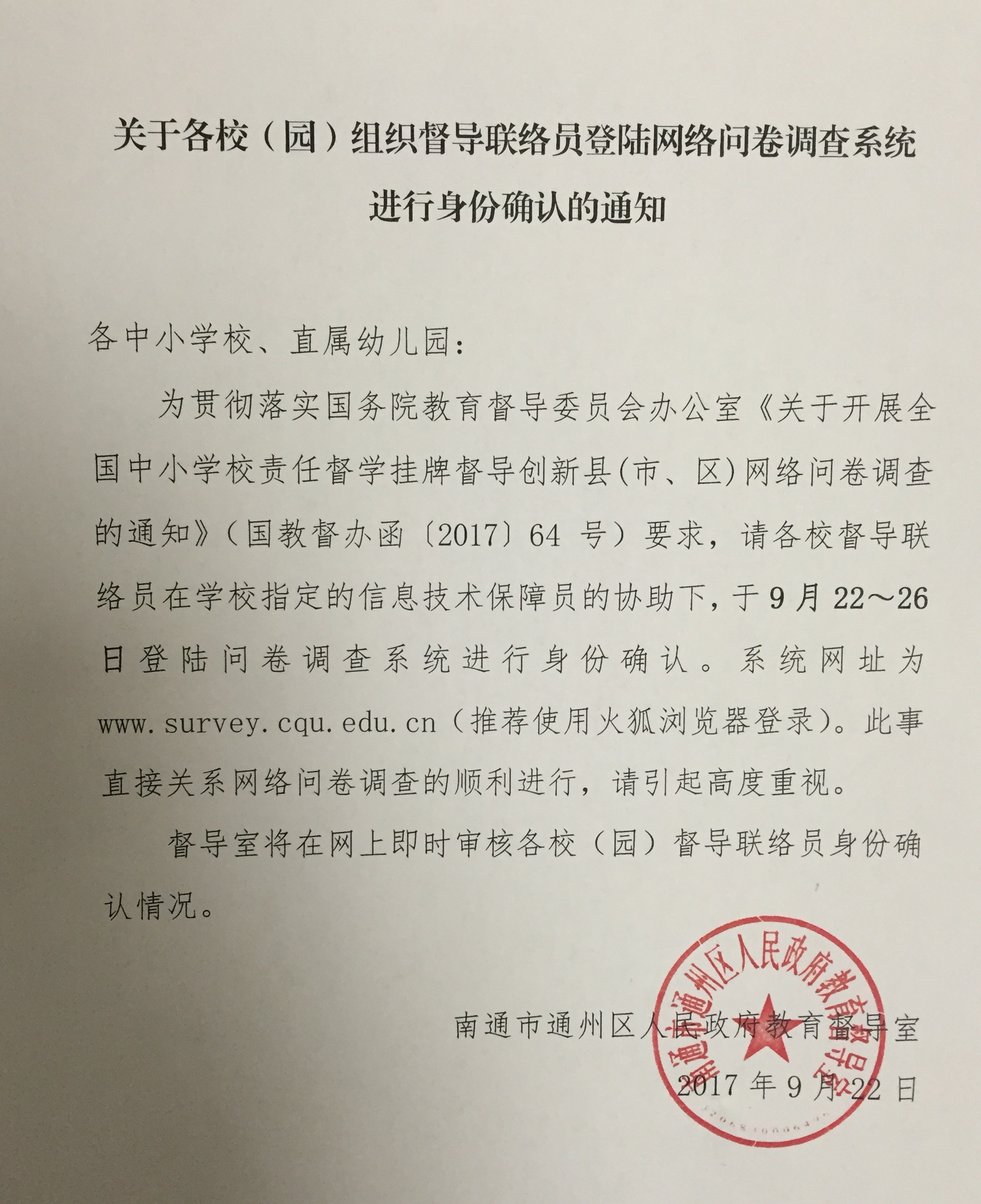 “全国中小学校责任督学挂牌督导创新县(区)”评估认定网络问卷调查工作开展近一个月来,南通市通州区创新工作措施,克服各种困难,问卷调查工作稳步有序推进,截止2017年10月22日22点,全区77所挂牌督导中小学校(园)10万多份教师问卷和学生家长问卷完成率均达100%。