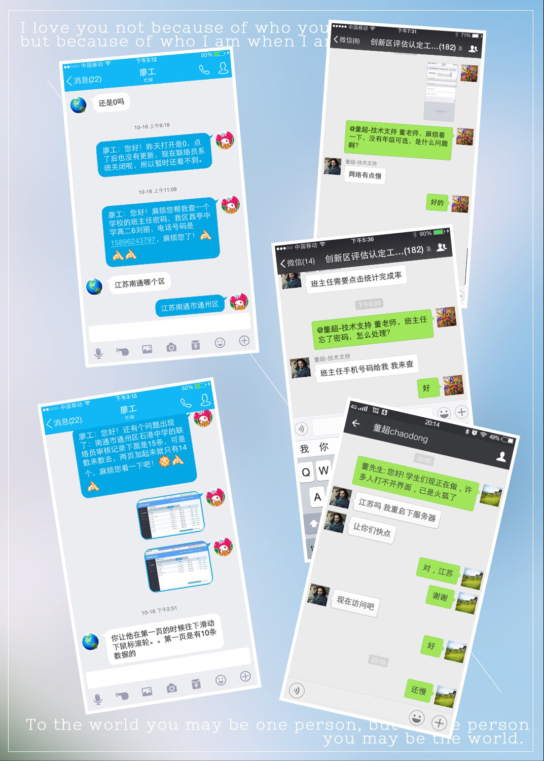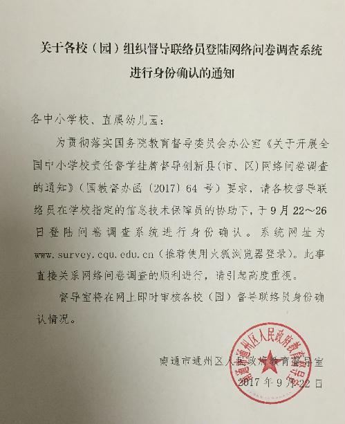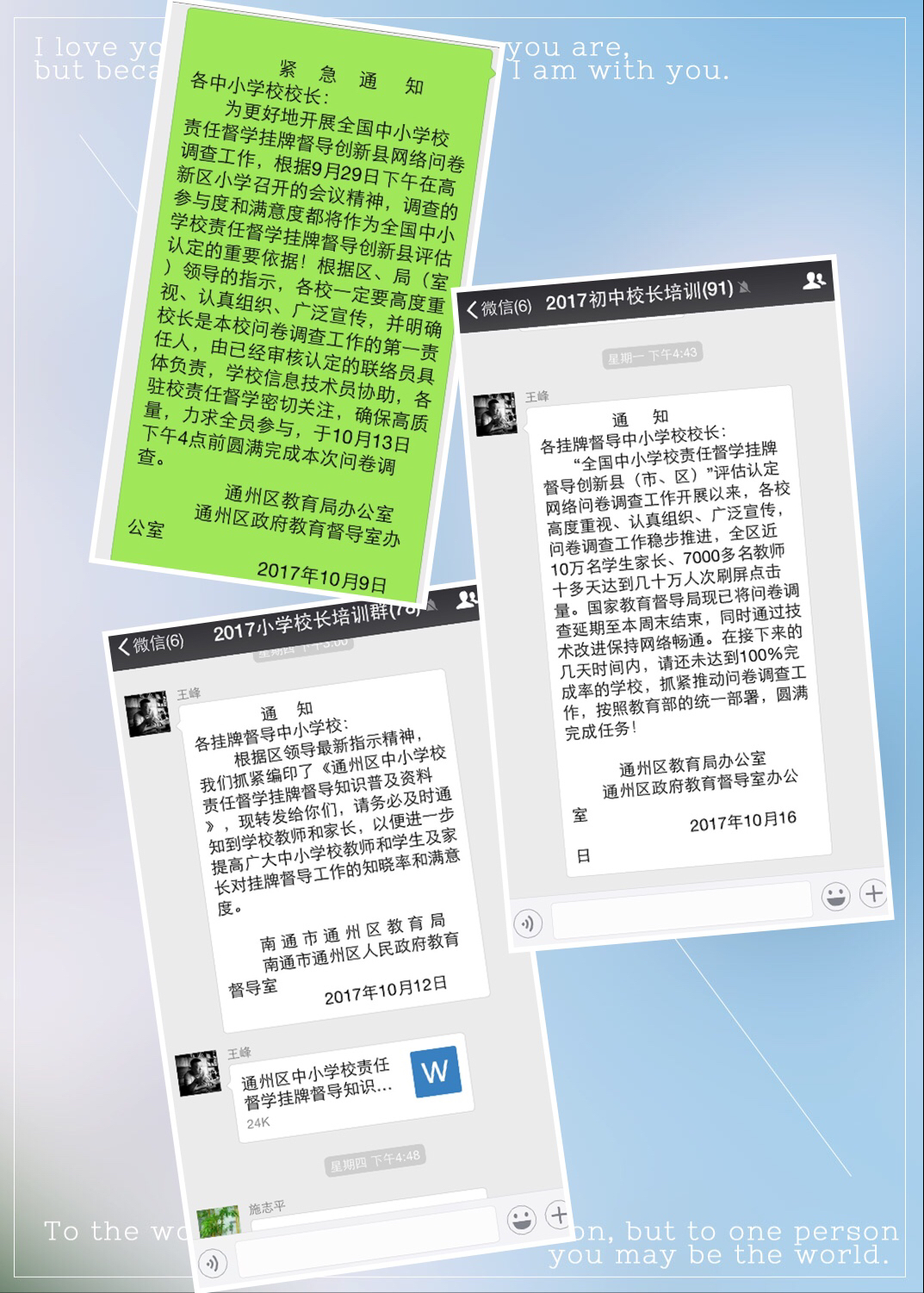 9月30日--10月22日,各校认真组织教师学生及家长答卷。答卷期间,各校联络员在通州教育督导QQ群、通州区挂牌督导微信群,互相介绍工作经验、创新做法,区级联络员及时与督导局网络技术人员沟通信息,不厌其烦解答各校答卷中出现的各种问题。