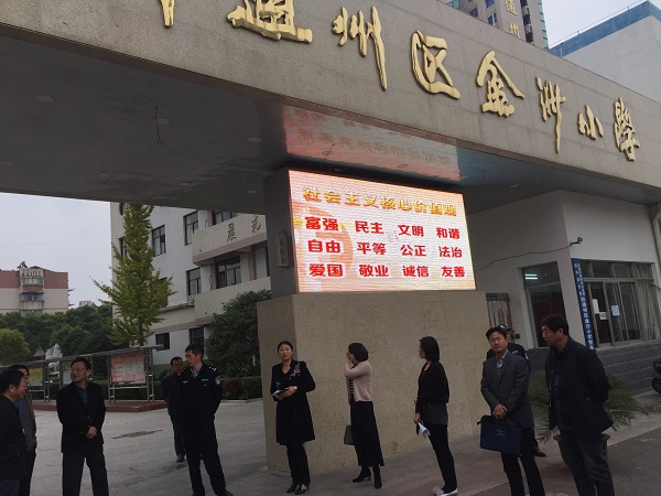 督委会考察组首先考察了金沙小学,在学校传达室查看了微型消防站,对筑牢学校安全第一道防线的安保工作表示肯定;深入学校食堂,充分肯定了食堂整洁卫生和管理工作,对食堂内物品摆放有序,大家忙而不乱,学校“全员参与、全部招标、全程监控”的管理模式保障了2800多名师生的就餐安全留下了深刻印象;考察组还饶有兴趣地参观了五(2)中队学雷锋活动展览室,对金沙小学坚持54年的学雷锋活动啧啧称赞;在听取了严永梅校长汇报学校安全工作后,区公安局副局长、区政府教育督导委员会委员、区政府督学张卫民当即表示:会及时研究学校放学高峰时段交通情况,协调、布置相关公安干警加强护学岗的工作;同时指出校园监控不要有盲区,对于校园内的安全隐患要及时排查,早发现,早解决。区体育局局长助理、区政府教育督导委员会委员、区政府督学陈克建议学校定期检查体育设施设备、注意学生体育课的安全防范与管理。