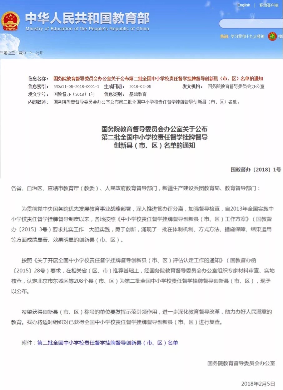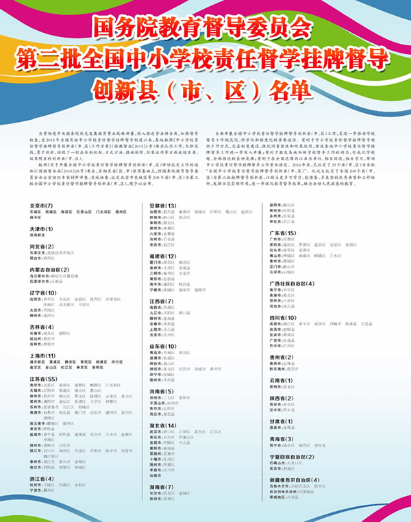 全国中小学校责任督学挂牌督导制度自2013年开始实施,此次开展的是第二批评估认定工作,在省(市、区)推荐基础上,国务院教育督导委员会办公室组织专家进行材料审查、实地核查,最终认定26个省、自治区、直辖市的208个县(市、区)为第二批全国中小学校责任督学挂牌督导创新县(市、区)。