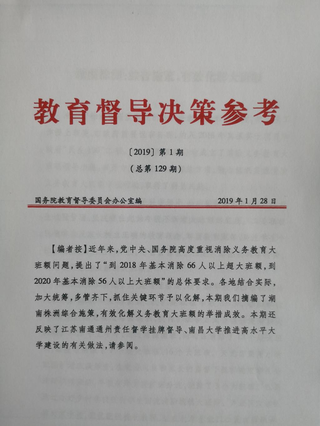 新春之际,传来好消息,国务院教育督导委员会办公室编发的2019年第1期《教育督导决策参考》刊出了我区“责任督学挂牌督导”经验做法,题目为“江苏南通通州:狠抓落实,挂牌督导润教育”,全面介绍了我区在“切实履行督导职责,倾力助推学校发展”理念下推动通州教育优质、均衡、特色发展的经验做法。