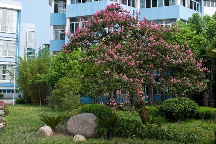 比邻蕊春园,遥对校门口。这,是一棵人人都为之惊叹的树,它有一个好听的名字——紫薇。屈曲的树干,斜斜地伸出去,于悠长的时光中生出一片浓浓的绿阴。