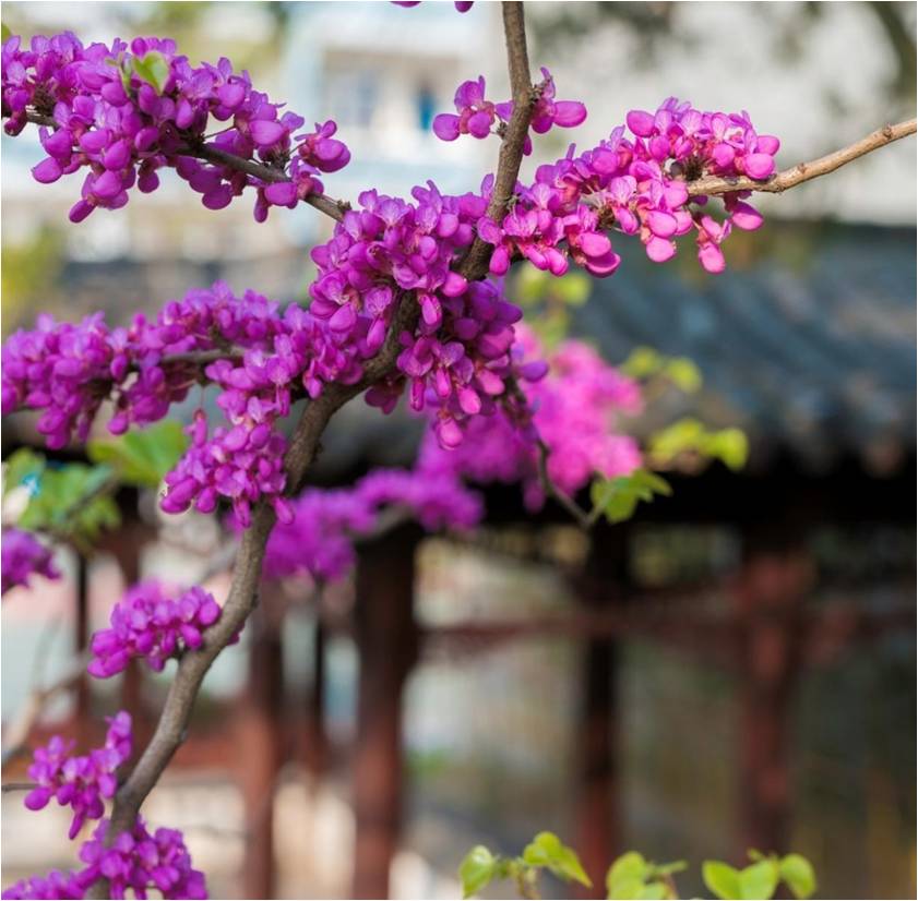 “杂英纷已积,含芳独暮春。还如故园树,忽忆故园人。”杂花纷纷落下,堆积在一起,伴着一定芬芳,恍如在故乡,想起故乡的人。韦应物的《见紫荆花》在芬芳中留下思念。人们将紫荆栽入自家庭院,就是为了家庭和美、骨肉情深这一份美意。