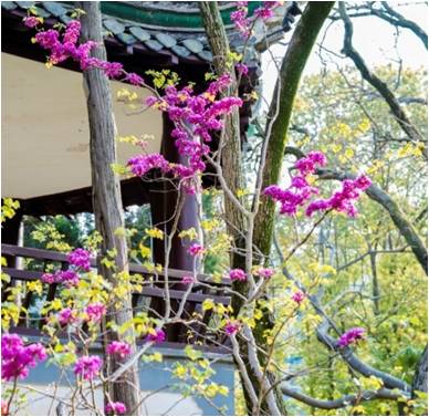 每年三四月间,花团锦簇,紫荆就成了和延月亭相得益彰的景致,这里是蕊春娃娃剪纸、写生、摄影的好去处。