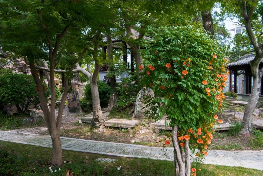 晚香阁与延月亭中间的小道旁,有一株极不起眼的植物,用木杆支撑着,侧着身子倚道而立,这就是凌霄。春日,当蕊春园里欣欣向荣之时,它却依然还在沉睡,枝干表皮脱落,呈枯褐色,让人觉得它已经没有了生命。7月的一天,你若从延月亭拾级而下,漫步大道时,你会惊喜地发现这里成了“灯笼”的世界,一朵朵凌霄花亲密无间地挤在一起,一片橙黄。柔弱的枝干竟变得热情无比,满载着熙熙攘攘的花开放了,把夏日的蕊春园照得明艳无比。9月的秋风,催促它再次回归平静,蓄积能量,期待来年花开。
