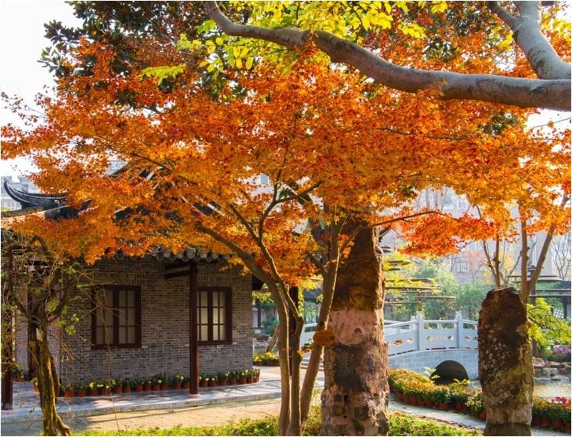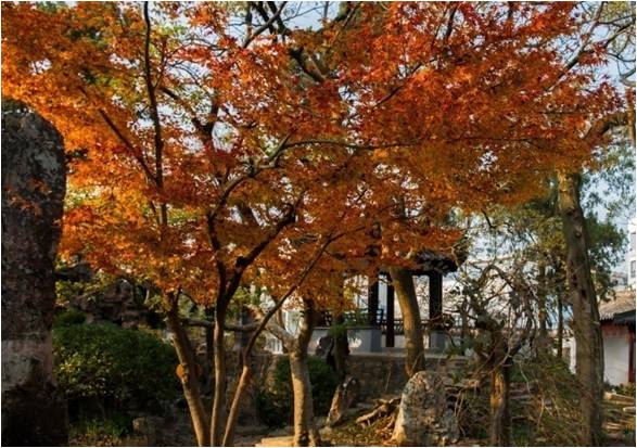 晚香阁与延月亭间,一株红枫傲然挺立,展现出百变身姿。春天,当第一缕春光洒向蕊春园的时候,她就悄悄地吐出新的芽儿。夏日,炎炎烈日下,她绿韵飘逸,依然优雅俊秀。秋风拂过,她笑红了脸庞,先是叶子的边缘发黄发红,可中间依然是绿色的,再后来红色渐渐地向叶子的中央扩展,红得热烈,红得艳丽。满树的枫叶在秋风中婆娑起舞,轻轻絮语,向人们诉说着蕊春园里秋的精彩,而此时的晚香阁则成了她最忠实的听众。寒风袭来,红叶们欢呼着扑进蕊春园这片肥沃的土壤中,等待着又一次生命的洗礼。