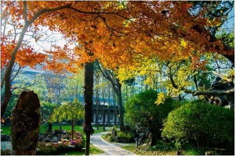 金秋时节,红叶似晚霞飘落,热烈一片,金红一色。此情此景,让人情不自禁地想起唐代诗人杜牧的千古绝句——“霜叶红于二月花”。坐在延月亭上远远地望着这一抹红色,耳畔渐渐地响起张继吟唱的经典诗篇——《枫桥夜泊》。捡起一片枫叶,聆听着来自蕊春园的声音,毛主席那慷慨激昂的诗句仿佛就在我们心头激荡——“问苍茫大地,谁主沉浮?”