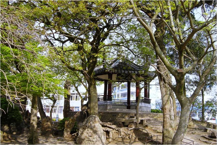 在蕊春园古树丛中有一座古老的建筑——延月亭。亭下凝望,黑绿相间的亭盖古朴典雅,上面以金黄宝葫芦镇顶,高高翘起的六个亭檐角,如反转的龙爪,颇有托月之势。红色的亭柱上刻着两副我校老师创作的楹联:“新韵穿云读曙色,古亭抱物延月华。”“吹箫山水眺明月,吟卷亭台唱晨曦。”生动地表现出实小人在亭中“品茗赏景看明月,读书吟唱作诗画”的一份宁静与自由。