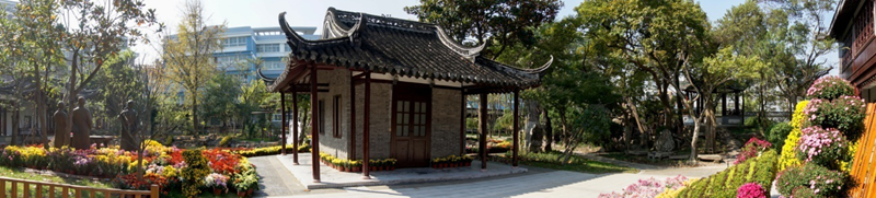 漫步葫芦池畔、站立摇篮桥头,你会邂逅一座古色古香、屋顶为攒尖顶的极具南通特色的方形建筑——阁。阁内摆放着琵琶和琴凳,这是学校琵琶社团和琵琶爱好者时常切磋技艺的地方。细细端详,寻其芳名,门前挂着一块匾,“晚香阁”三个字透着古朴与婉约,两侧的柱子上挂着一幅对联“傍桃倚李三春暖,赏桂品茗一水香。”她居于蕊春园的正中,前听葫芦池水潺潺、后倚鞠寿堂韵悠悠、左牵延月亭雄赳赳、右望雕塑群笑盈盈。静坐阁中,抬望眼,摇篮桥连载着菊径挽着晚香阁通向那明亮的前方。