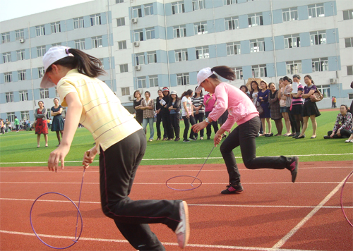 (7)教学“跳环法”: 在匀速行进中,用推手切入环的下口处,用力地往上挑,使铁环瞬息件间弹跳起来,在环落地后,以推手调控环的方向,摆正环的平衡点,再次向前推行,准备下一次的跳跃。