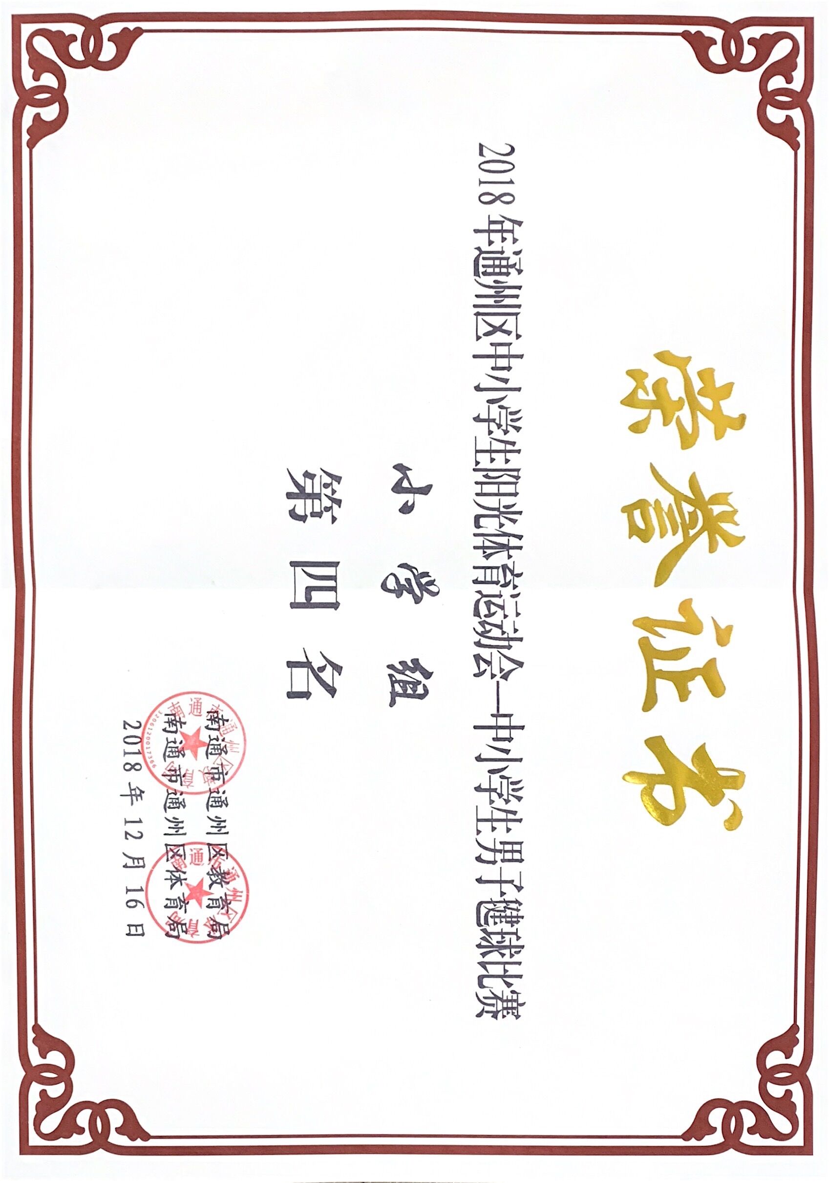 2018年通州区中小学生阳光体育运动会—中小学生男子毽球比赛小学组第四名(奖状)