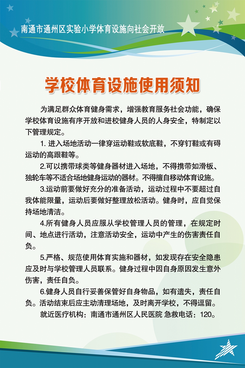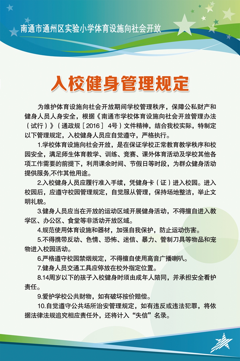 为实现学校体育设施资源社会共享,满足广大群众健身需求,根据国家、省和《南通市学校体育设施向社会开放管理办法(试行)》(通政规[2016]4号)文件精神,结合我校实际,南通市通州区实验小学体育设施从2017年7月1日起向社会免费开放。
