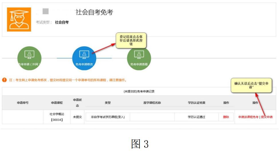 4.使用本人已毕业课程成绩用于申请免考的,可点击“江苏自考毕业生”,如出现可勾选课程用于免考申请的(如图2),须勾选后再点击保存,返回图3界面,点击免考申请修改,确认无误后点击“提交申请”。