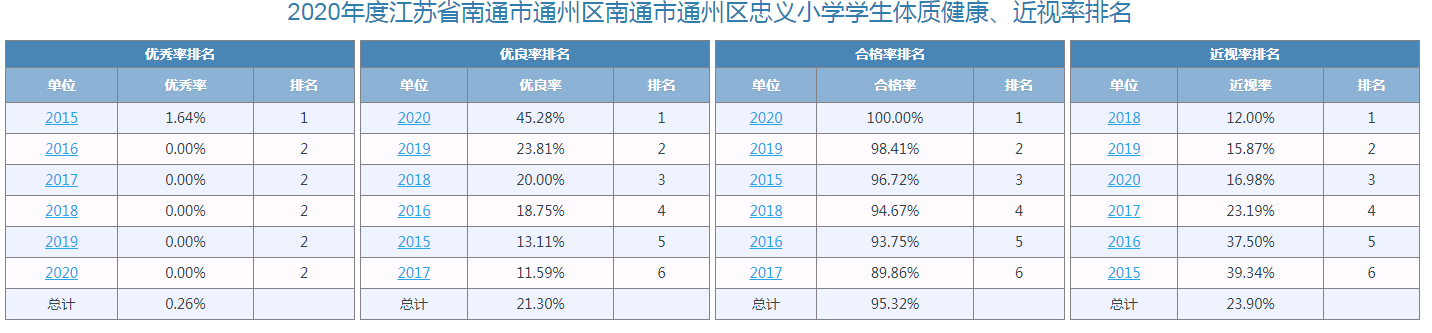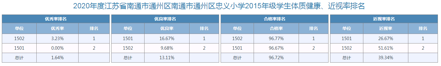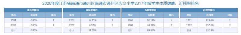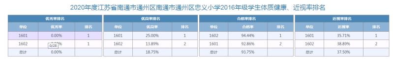2020学年度通州区忠义小学学生体质健康、近视率排名