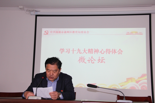 区教育局机关党总支书记钱国华在会上指出,认真学习、深入领会、大力宣传、全面贯彻党的十九大精神,是当前和今后一个时期教育系统的首要政治任务。教育系统每位党员,尤其是承担部门职责的局机关、教育督导室以及局直单位的每一位党员,更要把学习好、宣传好、研究好、落实好党的十九大精神作为当前和今后一个时期的首要政治任务,同时通过“比党性争先进、比作为争贡献、比效能争一流”活动,促使全体党员讲规矩、重人品,强本领、勇担当,进一步激发新活力,增添新动力,营造勇于担当、主动服务,奋发有为、比学赶超的良好氛围,把党的十九大精神转变为做好本职工作、推进事业发展的思想自觉和行动自觉,为加快建设“强富美高”新通州凝聚强大合力。