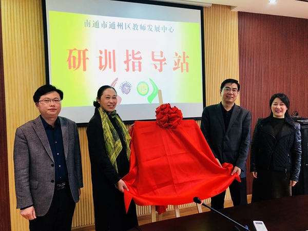 在热烈的掌声中,王笑梅总校长、陈汉兵主任、朱俊校长和邵丽霞校长共同为“研训指导站”揭牌。