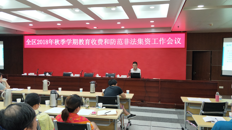 8月30日下午,区教育局与区金融办在行政中心第一会议室联合部署2018年秋季学期各类学校教育收费和防范非法集资工作。全区各中小学校财务管理员、各教育督导组分管领导以及幼儿园园长近180人参加了会议。