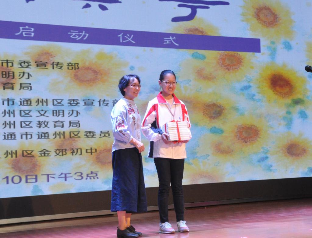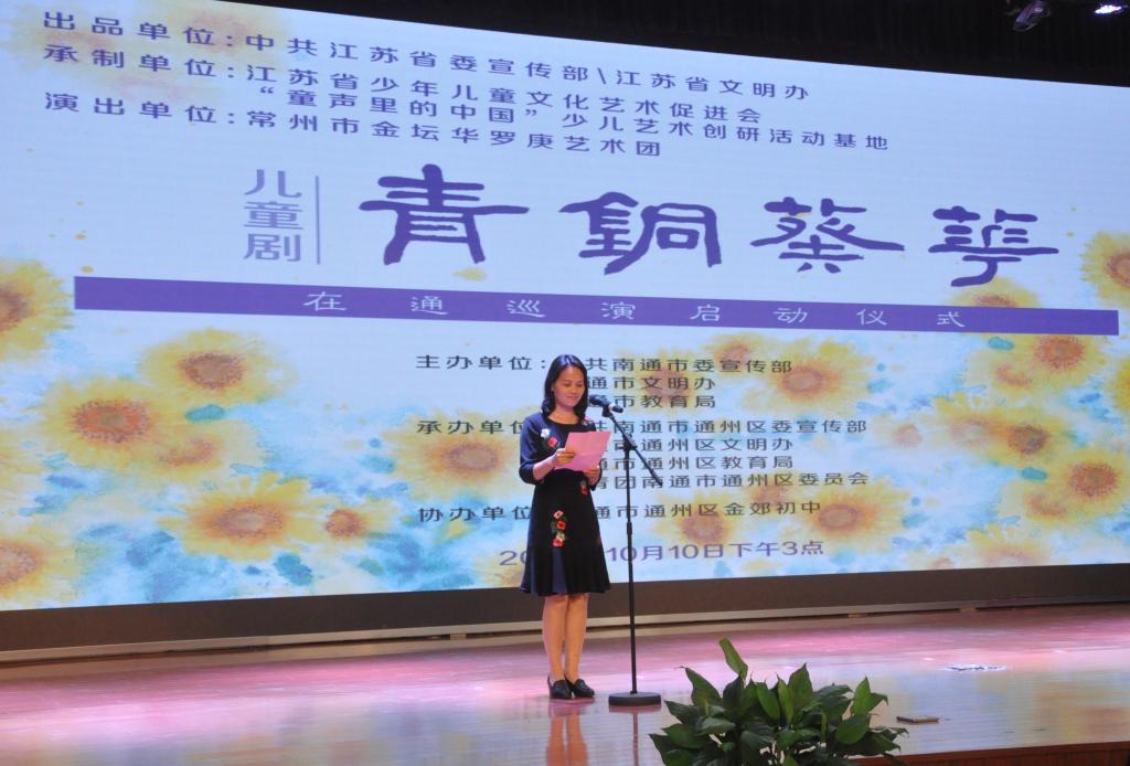 通州区人民政府副区长樊小燕主持了启动仪式。南通市委宣传部副部长蔡忠、通州区委宣传部部长胡卫东、江苏凤凰少年儿童出版社文学中心主任陈文瑛、通州区教育局局长张进荣等出席启动仪式。胡卫东部长向大家介绍了儿童剧《青铜葵花》改编排演的艰辛过程。蔡忠部长对该剧予以了高度赞赏,同时希望《青铜葵花》这部经典,能通过校园巡演真正走进孩子们的心中,让纯美的艺术力量影响更多的童年。江苏凤凰少年儿童出版社文学中心陈文瑛主任专程从南京赶来,赠送《青铜葵花》原著作品给金郊初中的图书馆馆藏。