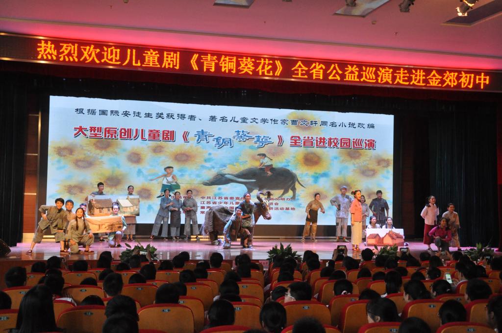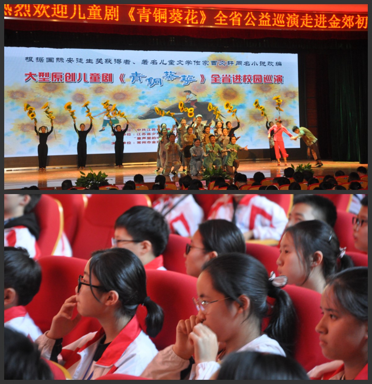 启动仪式后,全体领导、嘉宾与金郊师生一起,兴致勃勃地观看了演员们的精彩演出。儿童剧《青铜葵花》演绎了一个感动人心的故事:小女孩葵花在洪水中获救后被收养,她和油麻地农村哑巴男孩青铜成了兄妹,两人在奶奶的照料下共同成长。他们一起经历了贫穷的生活,也经历了“苦难中的美丽”。深刻的艺术主题对当代青少年的成长有很强的教育意义和现实价值。金郊初中的师生们认真观看了演出,许多人不禁深深为之动容。这场盛大的演出让大家的心灵经历了一次苦难美学的洗礼,让每一个学生都更加坚定了向阳生长葵花般纯净勇敢的心。刚刚获得“新时代江苏好少年”的朱天玺同学说:“作为新时代的青少年,我们要像青铜、葵花一样,面对生活常怀感恩,面对挫折坚韧坚强,面对困难勇于担当,争做新时代好少年。”
