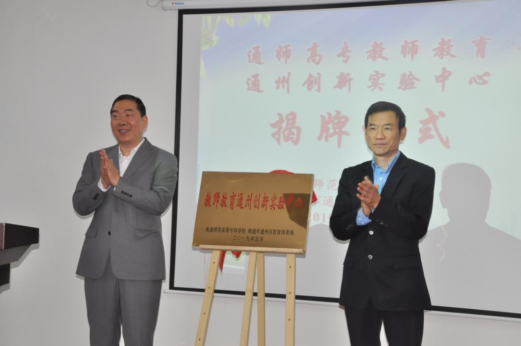 在与会领导、老师和学生代表的共同见证下,通州区教育体育局张进荣局长与南通师范高等专科学校孙国春副校长共同为“教师教育通州创新实验中心”揭牌。