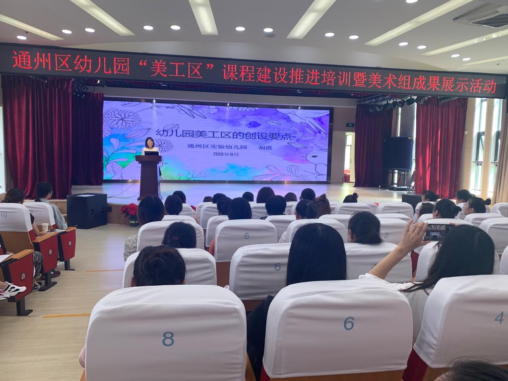为进一步深入贯彻《3-6岁儿童学习与发展指南》精神,学习理解并逐步落实《省教育厅关于加强学前教育教研工作的意见》,持续推进区域课程改革,9月30日,由通州区教师发展中心主办,通州区金桥幼儿园承办的通州区幼儿园“美工区”课程建设推进暨美术中心组阶段研究成果展示活动如期举行。区教师发展中心专职教研员徐玲艳、区教体局基教科幼教专干王向红、美术中心组全体成员及全区各幼儿园教研负责人等近百名老师参加了此次活动。