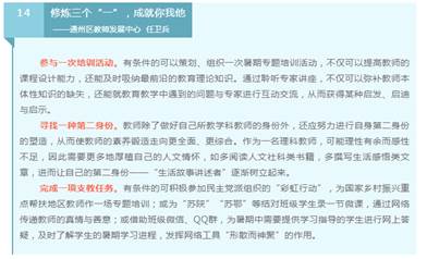 工作室领衔人任卫兵老师为自己制订的“参与一次培训活动”“寻找一种第二身份”“完成一项支教任务”的三个“一”行动计划,提醒教师及时地吸纳反思,不断地厚植情怀,主动地辐射引领,将促进教师更好地、更全面地发展。
