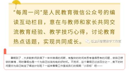 为了让教师利用暑期时间为自己更好地加油充电,南通市中青年名师任卫兵工作室借助“人民教育”微信公众号编读互动栏目,组织工作室成员开展了“互晒假期 目标共谋全人发展”交流活动。