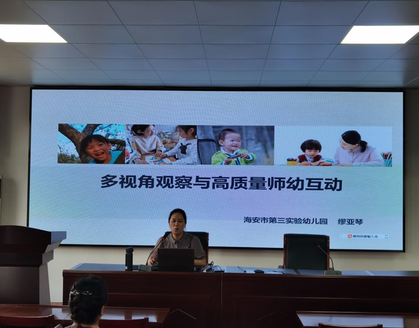 南通市第三实验幼儿园副园长缪亚琴以《多视角观察与高质量师幼互动》为题作报告,分享了如何抓住细节从观察入手提高师幼互动,提升校本研修质量。