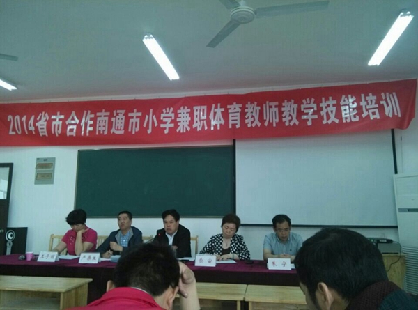 为解决南通市小学体育专职教师普遍缺编的问题,合理调配学科教师结构,提高兼职体育教师教学的基本能力,5月22日至25日,5月29日至6月1日,南通市教育局举办了2014年省市合作南通市小学兼职体育教师教学技能培训活动。5月22日,培训班在通州区金郊初中新校区开班,通州区教育局副局长严鼎生主持了开班仪式。南通市教育局副局长樊建清、南通市师资处处长余宙、南通市体卫艺处处长朱宁、南通市中小学教师研修中心培训部主任王子丽等出席了开班仪式,通州区各小学89名体育兼职教师参加了培训活动。
