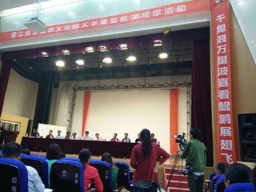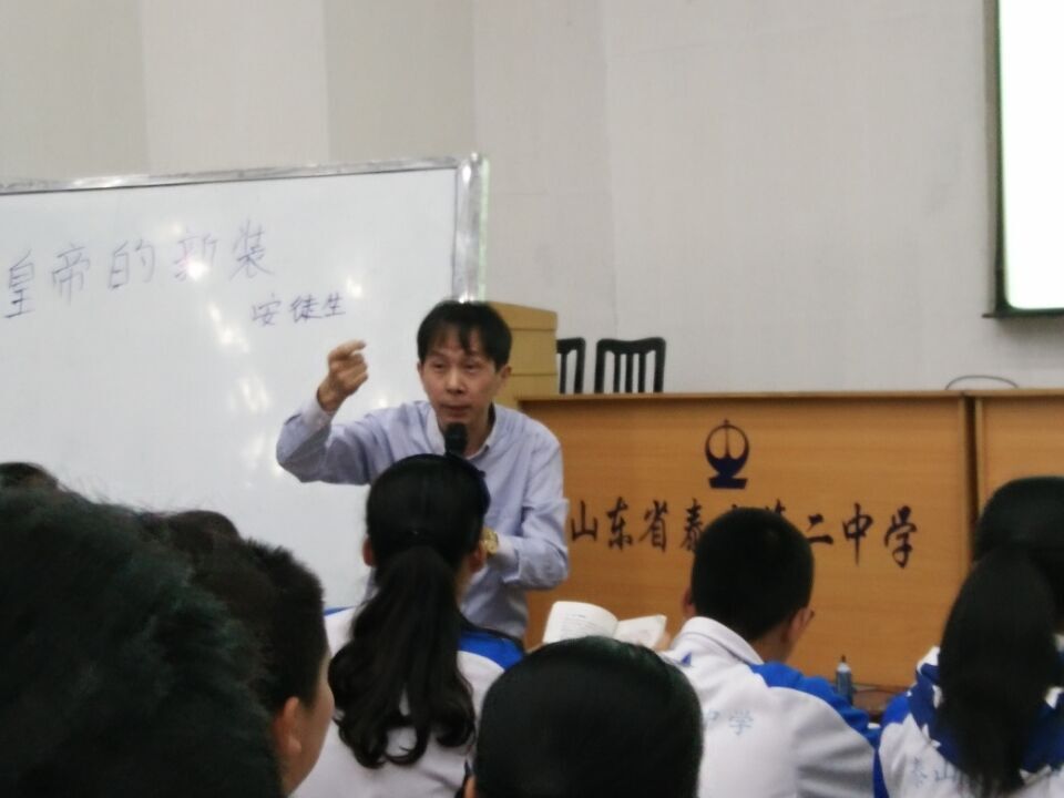 全国语文教师文学教育展评活动,以其新视角、新理念、高规格、高质量引起广大语文教师的关注。本次活动吸引了来自全国各地600多人与会,观摩了初高中各10位老师展示的文学课堂。初高中评委会分别由全国中语会副理事长、吉林教育学院教授王鹏伟先生和全国中语会学术委员会主任、天津市特级教师尹道恩先生担任组长,各省市教研室、中语会专家担任评委。作为特级教师的丁卫军应邀展示了童话课堂《皇帝的新装》。整堂课以其独到的文本解读、机智幽默的语言、娴熟的课堂驾驭技艺,赢得了评委会的肯定。泰安市教研员孙善利先生听课后,用短信评价:丁老师的课“顶天立地,顶‘人性’之天,立‘语言’之地,难得”。
