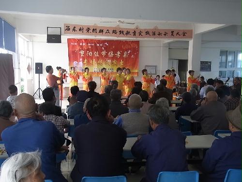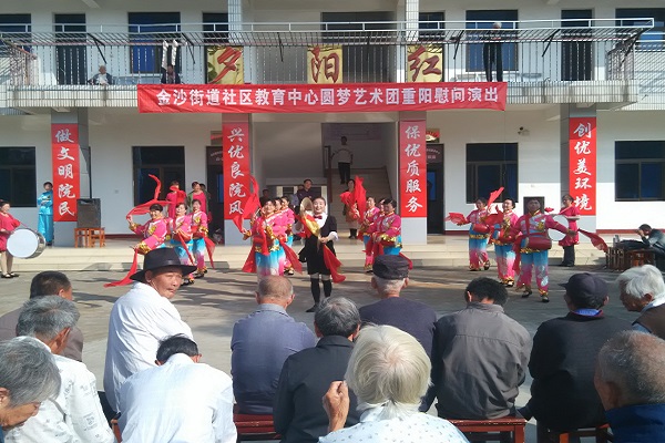10月21日,适逢中国传统节日九九重阳节,金沙街道社区教育中心组织圆梦艺术团到金沙镇农村社会福利中心、金沙镇老年公寓进行慰问演出。艺术团表演了《欢乐腰鼓》、《女兵串烧舞》、《莲湘舞》、《二月里来》、《男生独唱》、《越剧联唱》、《红灯笼广场舞》等十多个节目,大家说拉弹唱载歌载舞,给福利中心的老年朋友们带去了节日的祝福和欢乐。