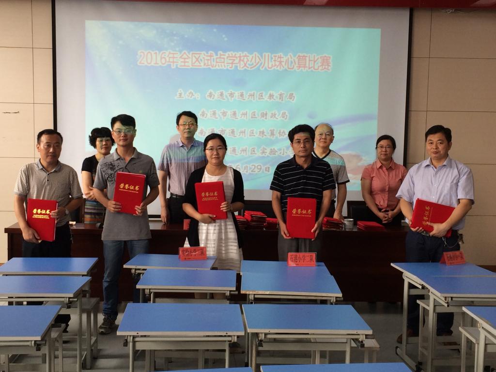 6月29日,区教育局、财政局在实验小学联合举办2016年试点学校少儿珠心算比赛,实验小学、石港小学、金沙小学、刘桥小学、张芝山小学的95名珠心算小选手参加了一、二、三年级组的角逐,经过三个多小时的激烈竞争,金沙小学、石港小学、实验小学分获一、二、三年级组团体一等奖,施语欣、邢于飞、王珏分获一、二、三年级组个人全能一等奖,谢永华、时美丽、葛苏琴获得教练奖一等奖。