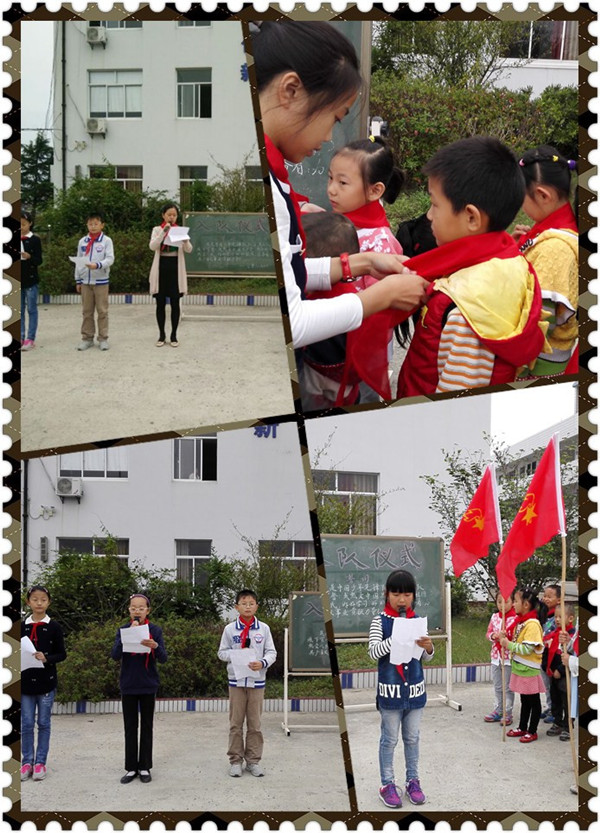 首先,少先队辅导员宣布了新生入队名单,由五年级的大哥哥大姐姐为他们戴上了鲜艳的红领巾,新队员们在大队辅导员徐老师的带领下,面向鲜红的队旗,举起右拳,庄严宣誓:“我是中国少年先锋队队员,我在队旗下宣誓……”接着,六年级老队员陶然同学代表全体少先队员表示热烈的欢迎,一年级新队员丁张芮同学在发言时,表达了全体新生的兴奋与激动,并用稚嫩的话语表决心。大队辅导员向他们提出了殷切的希望,希望他们以队员的标准严格要求自己,努力学习、热爱劳动、团结协作、积极参加校内外的各项有意义的活动,努力为红领巾增添新的光彩。