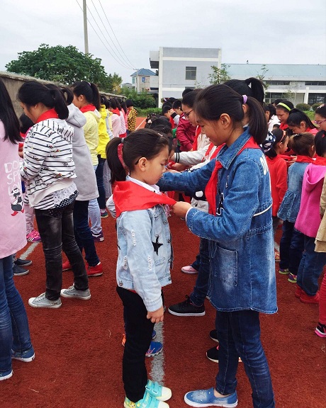 仪式上,老队员代表为新队员们授戴红领巾。嘹亮的队歌、火红的队旗、鲜艳的红领巾、庄严的呼号,让全体队员接受了爱国主义教育和励志洗礼。 (陈爱红)