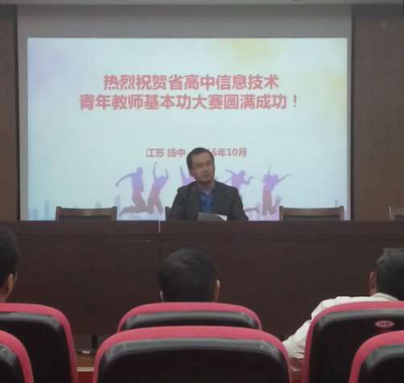 由省教育厅主办、省教研室承办的2016年江苏省高中信息技术青年教师教学基本功大赛于10月10日至14日在江苏省扬中高级中学举行,来自全省13个大市的26名选手参加了角逐。大赛从通用技能和专业技能两个方面全面考查参赛选手的教学基本功,共分理论与技术操作考试、粉笔字比赛、即兴演讲比赛、教学设计与课件制作比赛和课堂教学比赛五个环节。内容涉及到量子通讯、微软智能机器人、数据结构、数据库、路由交换、网站设计、PS、VB编程等多方面,难度为历届之最,竞争异常激烈。