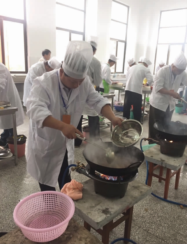 经过食品安全等知识的理论考试后,厨师们摩拳擦掌地上阵了。运刀如风,肉丝、笋丝丝丝分明,根根如一;肝片、肉块厚薄均匀,大小合适;松鼠鱼的剞花真像一朵花儿。点火、倒油、炒菜,挥铲似舞,配以叮叮咚咚的声音,划出一道道优美的曲线。不一会儿,就闻到了诱人的香味。