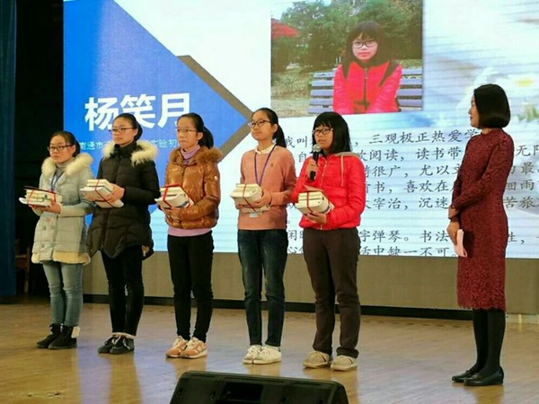 杨笑月同学获得如此殊荣绝不是偶然的。她一直是个勤奋好学、向着理想执着前行的人。她平时十分注重全面发展,读书、弹琴、书法、绘画都是她生活中必不可少的元素。钢琴早过了十级,依然每日必弹;书法飘逸秀美,但依然拜师不辍。不仅如此,她给自己开的书单更是让同龄人望尘莫及,获此殊荣可谓名至实归。在获奖感言中,她却十分的谦虚,她感谢大赛的评委们对她的肯定,感谢老师对她的指导栽培,感谢父母对她的培养支持,唯独没有感谢自己的艰辛付出。如此品学兼优的孩子让在场的每一个通州人感到骄傲!(钟石)