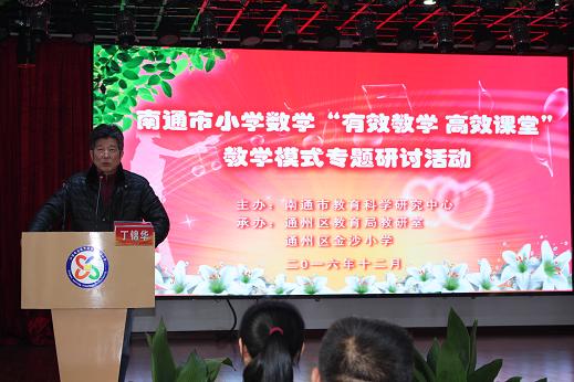 金沙小学校长严永梅在活动开始前,向全体来宾作了题为“追求大美境界,享受幸福教育”的专题汇报,着重介绍了金沙小学办学特色、办学成果、“问学”模式的课堂教学改革情况、以及今后学校的发展目标。南通市教育研究中心小学数学教研员丁锦华老师致开幕词,并向全体与会老师作了题为“核心素养的不同表达之我见”专题讲座。他的讲座,聚焦“核心素养”,瞄准学生全面发展,对数学核心素养及内涵进行了深入的解读和阐释,实例鲜活,具有很强的操作性和实用性,赢得与会代表阵阵掌声。南通市教育研究中心党支部书记须中,对活动进行了总结,他着重就青年教师成长,提出了殷切的期望,他希望全体南通的小数人,要有研究的自觉,要有责任意识、担当意识,要起辐射带头作用,使小学数学学科,成为全市教育系统学科教学改革的排头兵、领头羊。