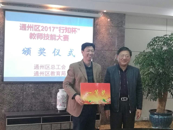 由区教育局和总工会主办,区教师发展中心、区教育工会、南通市陶研会通州分会承办的2017年“行知杯”中青年教师教学技能比赛决赛于4月12—14日在金沙中学举行。来自全区各初中并经层层选拔的46名初中地理、物理、数学教师经过了粉笔字、教学设计、课件制作、微型课堂等项目的激烈角逐,平潮初中陆志强、十总中学张启峰、育才中学曹青波、育才中学庄建华、育才中学陈金磊、实验中学单明祥等六位老师获得参加南通市“行知杯”中青年教师教学技能比赛决赛资格。此项比赛列入南通市通州区职工职业技能大赛,对于获得三门学科综合前六名的选手,由通州区总工会授予“通州区五一创新能手”称号。对于获得三门学科综合第一名的选手,由通州区总工会授予“通州区五一劳动奖章”,并按程序报请通州区劳动竞赛委员会授予“通州区金牌职工”称号。