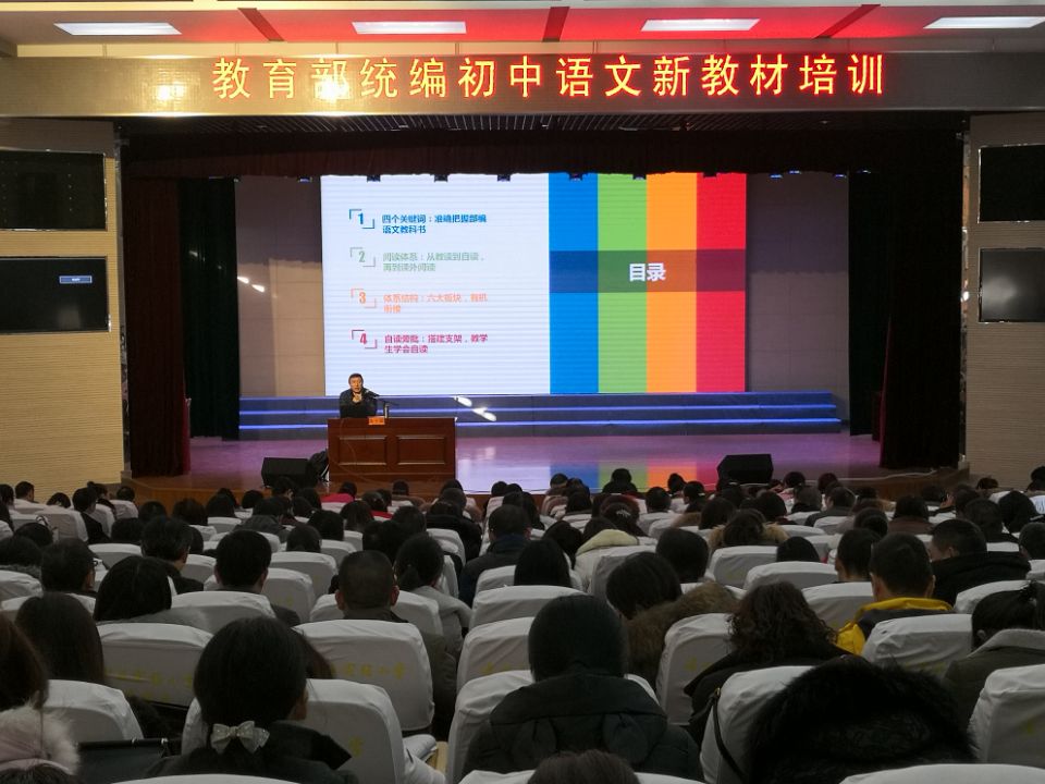 本次培训活动由区教育局局长室牵头,区教师发展中心葛建华主任主持活动。全区初中语文教师近三百人参加了本次新教材培训活动。(狄袁辉)