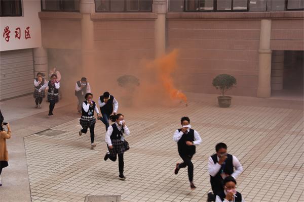本次火灾应急疏散演练的假设情景为:11月8日下午,金沙中学之远楼发生火灾,此时高一全体师生正在之远楼内上课,情况十分危急。接到报警后,本次消防演习总指挥薛军副校长、现场指挥顾锋杰副校长立即启动消防应急预案,组织协调组、通信联络组、疏散引导组、抢险救护组和后勤保障组立即到位,按照预案设定的分工,组织学生撤离模拟火灾现场。高一全体学生依据消防疏散要求,从各自疏散通道成两路纵队撤离,同学们用湿毛巾捂住嘴、鼻,弯着腰,迅速小跑至操场。高一全体教师进行现场疏散引导,全体师生安全有序撤离至集结地点后,班主任立即清点人数,并由年级组长向级部总负责人报告,级部再向指挥长报告人数,无一遗漏。从准备部分到报警部分、疏散部分,总共用时3分50秒。整个过程安全、有序、快速、高效,获得与会人员的高度评价。