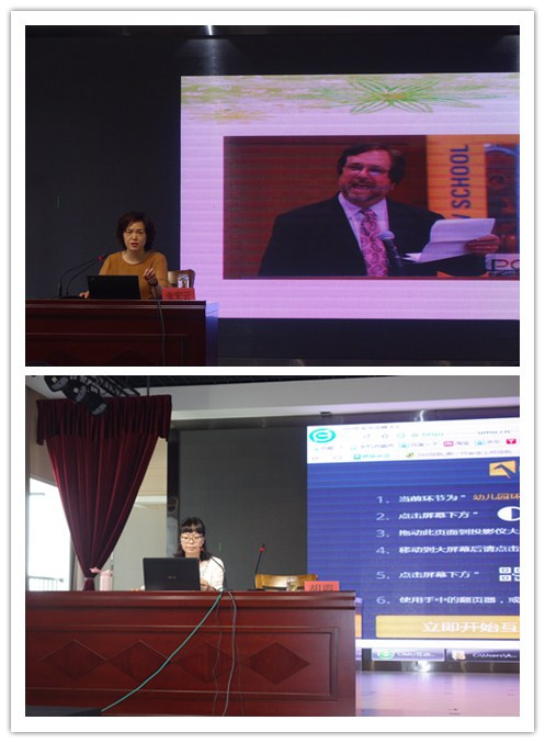 17日上午,通幼虹西分园的胡霞园长的讲座给老师们耳目一新的感觉,UME网络互动平台的运用与老师们开展了有趣的互动,同时了解了一线教师对于幼儿园环境创设的理解。随后,有针对性地分享了短短一年的时间里通幼虹西分园的实践积极。并通过大量的图片和实例详解了环境创设的分类、班级区域环境创设的原则及各区域的设置要点、材料分类等内容,丰富的理论知识结合生动具体的案例,引导老师们进行深入的思考,为幼儿园环境创设的进一步优化提供了切实有效的指导意见。