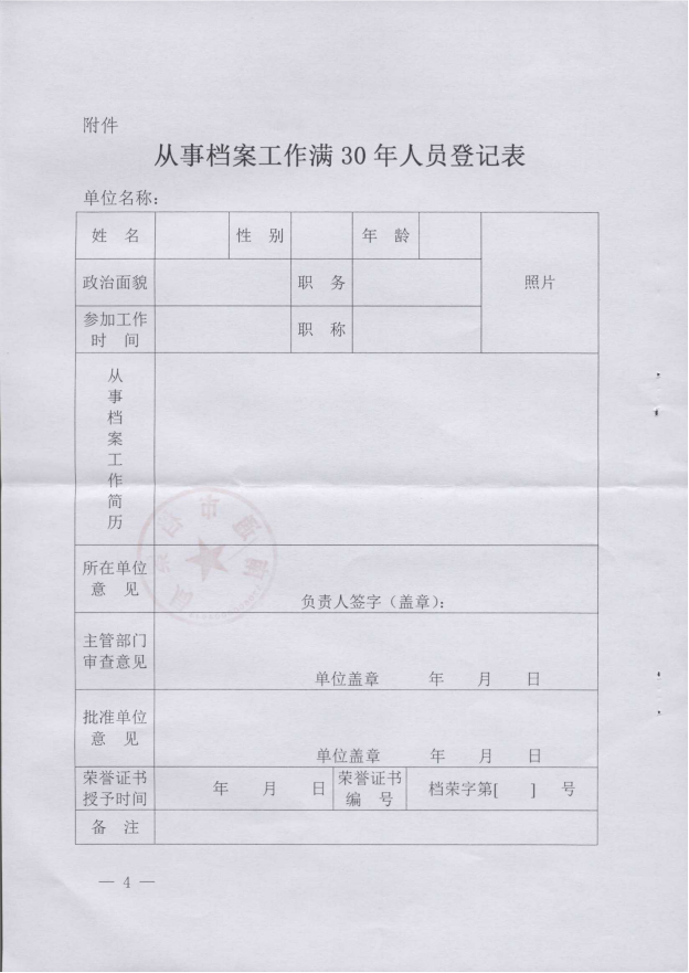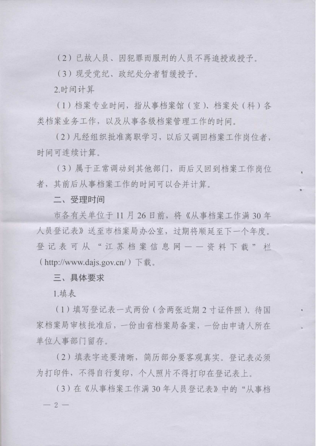 现将南通市档案局《关于做好2018年度从事档案工作满30年人员登记并颁发〈荣誉证书〉工作的通知》转发给你们,请组织本单位及下属单位符合条件者积极申报,并于2018年11月20日前将《从事档案工作满30年人员登记表》及照片报通州区档案局秘书编研科办理,过期将顺延至下一个年度。