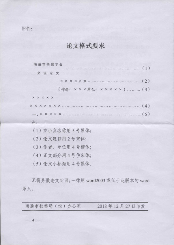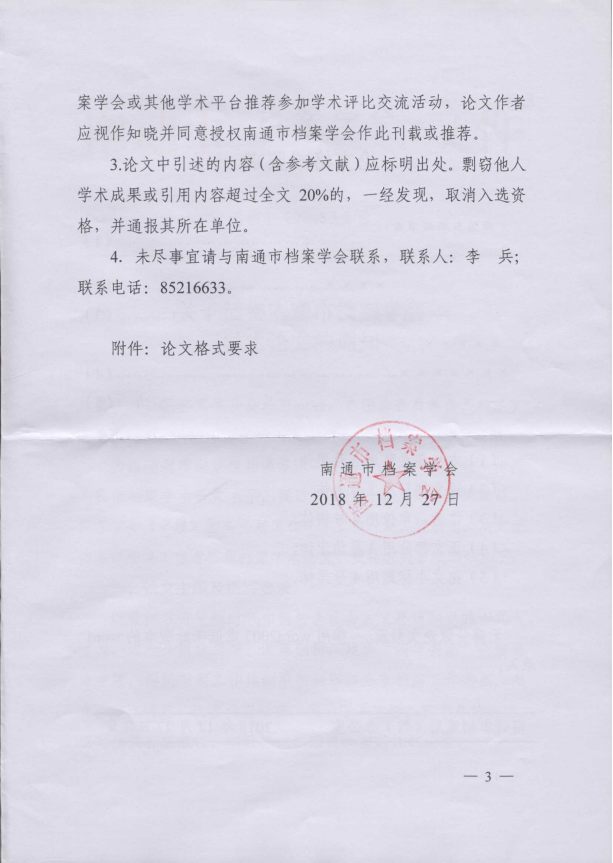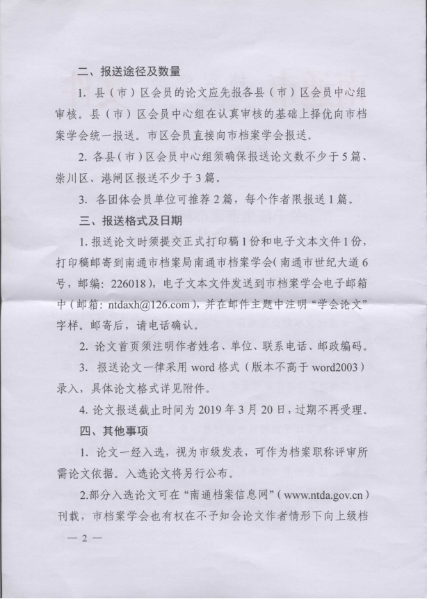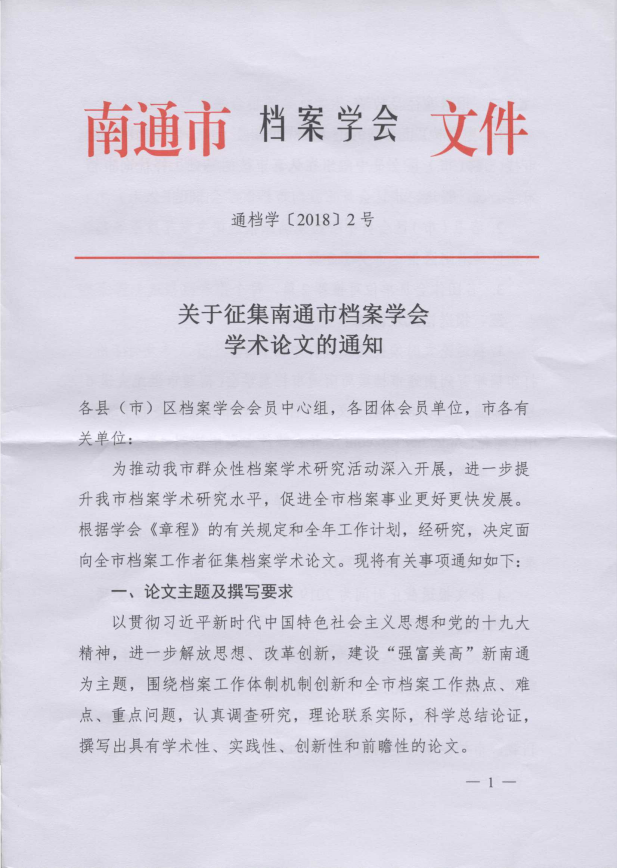 为推动学术研究,促进通州档案事业高质量发展,现将南通市档案学会《关于征集南通市档案学会学术论文的通知》转发给你们,请各地各部门认真组织所辖区内的档案工作者撰写学术论文并于2019年3月1日之前将纸质和电子版报送至区档案局秘书编研科,逾期不再受理。根据规定,论文一经入选,即视为市级发表,可作为档案职称评审所需论文的依据。