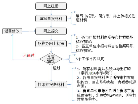 1.单位审核。申报人所在单位要严格按照规定程序,做好审查、公示、推荐等各环节的工作,确保申报材料的真实、完整。单位审查人须在申报人提供的所有带JSDA水印打印件上签字盖章、注明日期。不具备人事档案保管权单位的申报对象,单位只对其工作业绩、论文、专业工龄、任职资格等进行核实并盖章。其学历、工作经历(简历)等由人事档案代理机构进行核实并签字盖章。