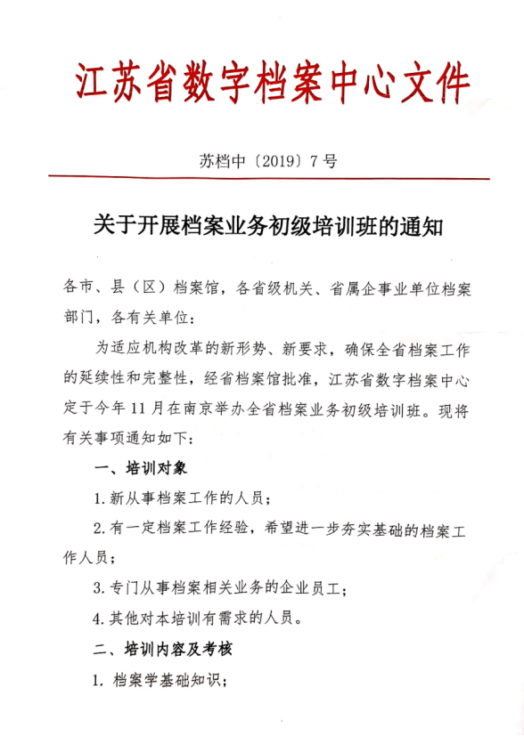 关于转发江苏省数字档案中心《关于开展档案业务初级培训的通知》的函