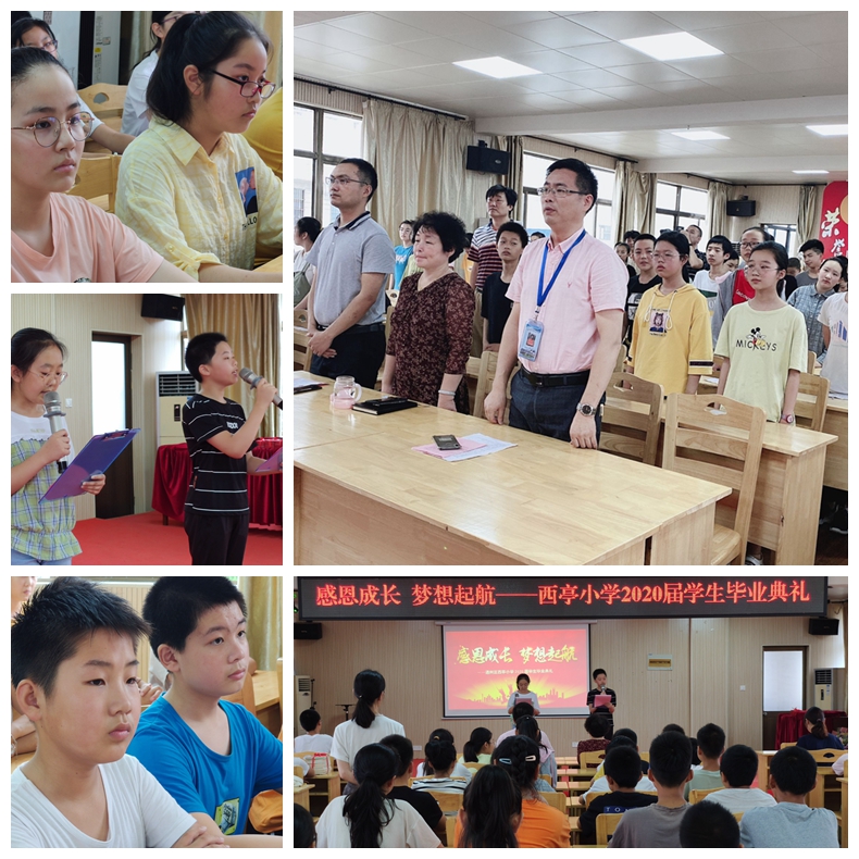 7月8日,初夏微凉,天空淡墨如画。西亭小学和正楼三楼报告厅里掌声阵阵,乐声回荡,洋溢着一片欢乐祥和的气氛。全体六年级师生齐聚这里,隆重举行以“感恩成长,梦想起航”为主题的2020届学生毕业典礼。八点四十分,主持人宣布典礼正式开始。
