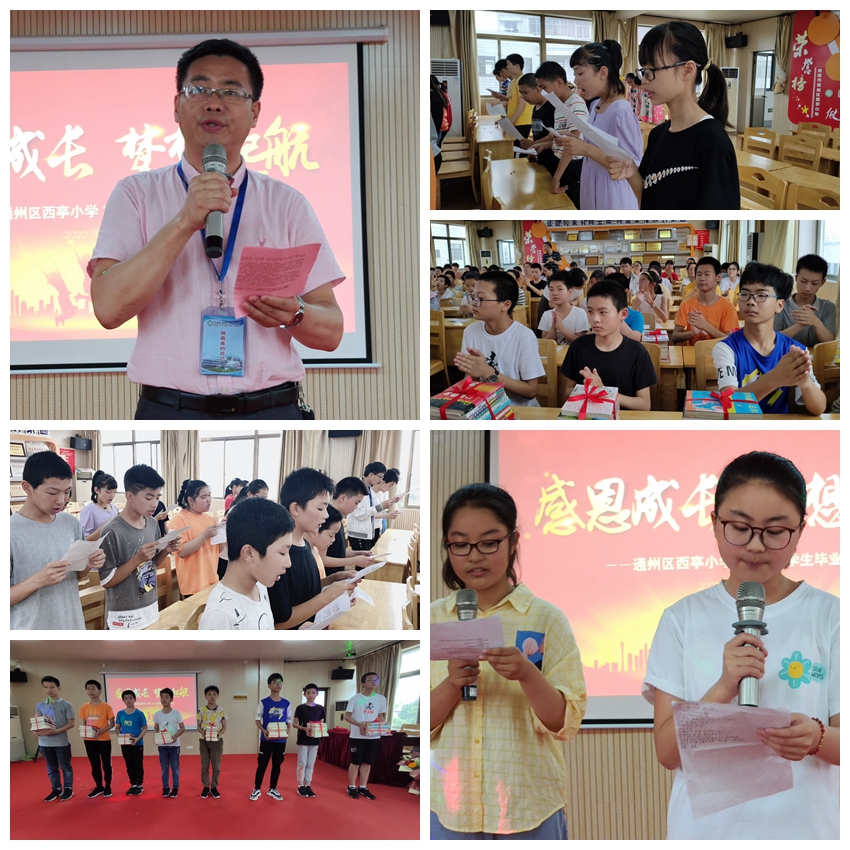 在往昔校园生活的一个个镜头前,孩子们深情朗诵《告别母校》,用最美的声音表达了对母校的眷恋,为母校与自己起航。西亭小学校长曹立新亲临现场并致辞,他向顺利完成小学学业的同学们表示诚挚的祝贺,向为了同学们健康成长而奉献心血与智慧的老师们表示衷心的感谢!曹校长叮咛孩子们,要珍惜时间、胸怀大志、学会做人、热爱读书、懂得感恩,这谆谆教诲,这殷殷希冀,相信每一个孩子都将铭记心中,伴随一生。接着,学生代表将留有自己成长印记的课外书籍赠送给母校图书室,以此感恩母校、传递书香,给母校留下一个永恒的记忆。