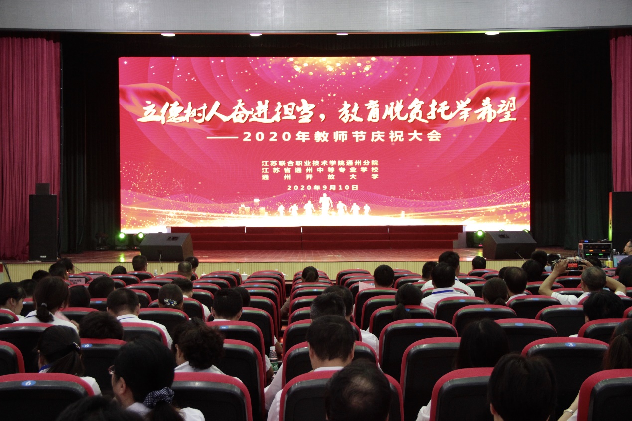 丹桂飘香的九月,通专合和,祥宁静好!为展现全校教职员工立足教育教学岗位助力打赢新冠肺炎疫情防控阻击战、教育脱贫攻坚战的精神风貌,激励大家守教育报国初心、担筑梦育人使命,9月10日,通州中专在大礼堂举行“立德树人奋进担当,教育脱贫托举希望”第36个教师节庆祝大会。通州区人社局副局长吴卫东,通州区科技局副局长黄东晓,通州区融媒体中心副主任王云峰,通州区红会副会长陈建芳,通州区教体局党委副书记、督导室副主任薛小玉,通州区纪委派驻第十纪检组严蔚民书记,通州区教体局副局长吴伯军、局领导欧仕军等领导出席庆祝活动,通州区相关部委办局领导、育才社区等社区代表以及校企合作企业代表,全校教职工、退休教职工代表、学生代表参加庆祝活动。