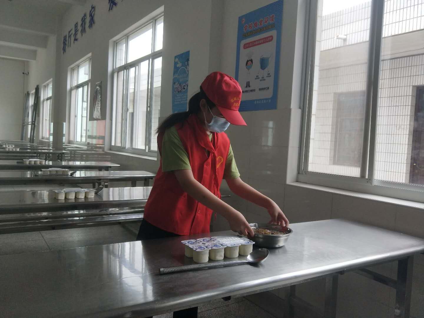 小志愿者们带上口罩,走进食堂,在食堂工作人员的指导下进行摆餐具、推餐车、端饭菜等劳动实践活动。瞧!小志愿者们两人一组,全神贯注地推着餐车,小心翼翼地将饭菜一一摆放在桌上,配合默契的他们成了食堂里一道靓丽的风景线。
